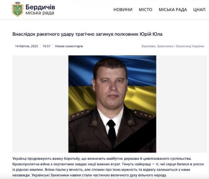 Бердичівську громаду спіткала болюча звістка про загибель українського Оборонця, професійного військового полковника Юрія Юли внаслідок ракетного удару, завданого ворогом".