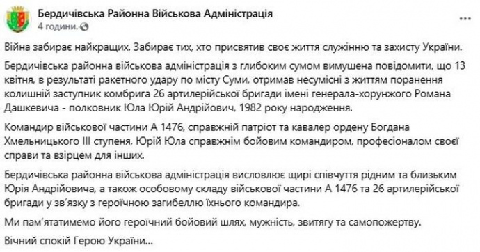 Деталі: За даними Бердичівської районної військової адміністрації, Юла отримав несумісні з життям поранення через російський ракетний удар по місту Суми 13 квітня.