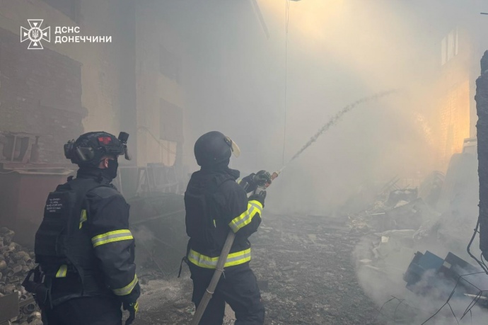 Дослівно служба: "Шість БпЛА атакували промислову зону міста Слов’янськ на Донеччині: одна людина поранена. Виникла пожежа в будівлі СТО та поруч розташованій складській споруді. Понад три години знадобилося рятувальникам аби приборкати займання на площі 100 кв.м".