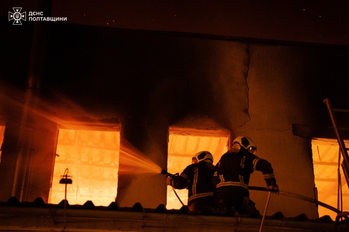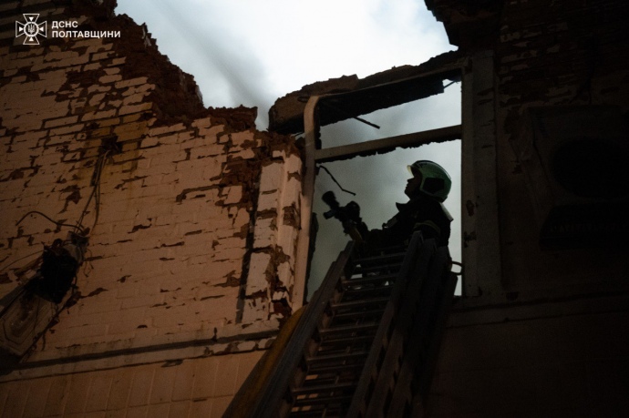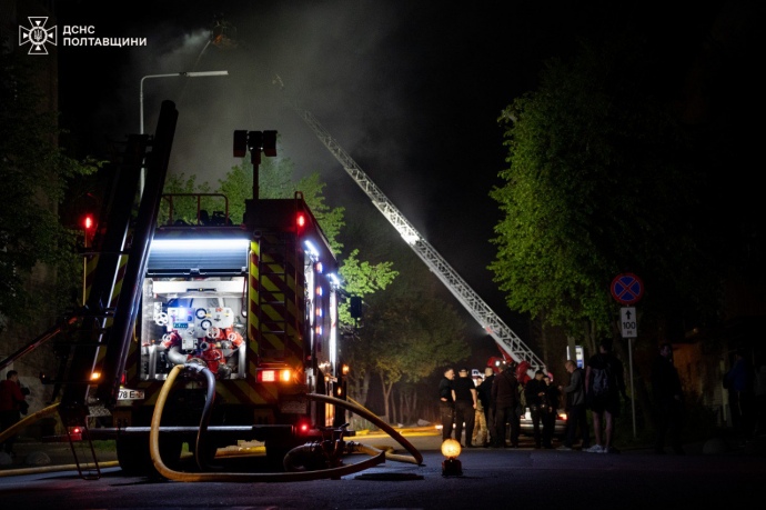 Пряма мова: "Полтавську громаду атакували ворожі БпЛА. Станом на 00:10 є повідомлення про влучання по підприємствах та відкритих територіях поблизу цивільних об’єктів у Подільському та Шевченківському районах Полтави".