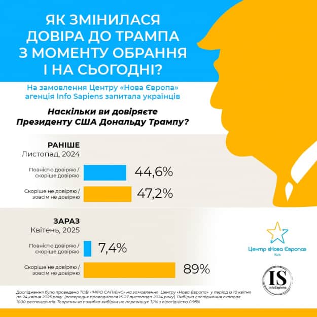 Деталі: Українців опитали щодо довіри до Трампа й станом на середину квітня 2025 року повністю довіряють, або скоріше довіряють американському лідеру лише 7,4%, на противагу 89%, які не довіряють йому.
