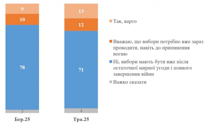 Водночас з 78% до 71% стало менше тих, хто вважає, що вибори мають бути лише після повного завершення війни.