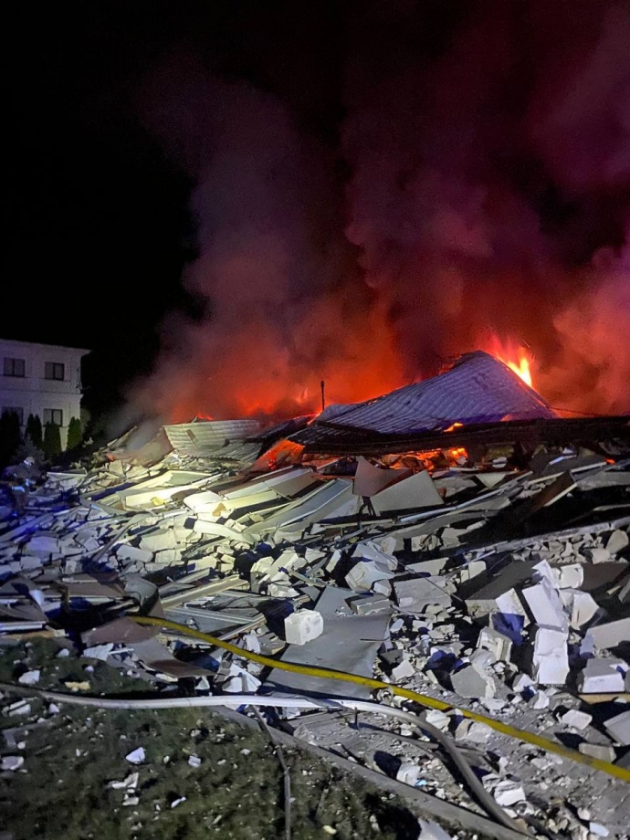 Пряма мова Когута: "Унаслідок прямого влучання та падіння уламків у Кременчуцькій громаді знищено будівлю одного з підприємств. Виникла пожежа, яку локалізували підрозділами ДСНС. Вибуховою хвилею пошкоджено 7 приватних домогосподарств".