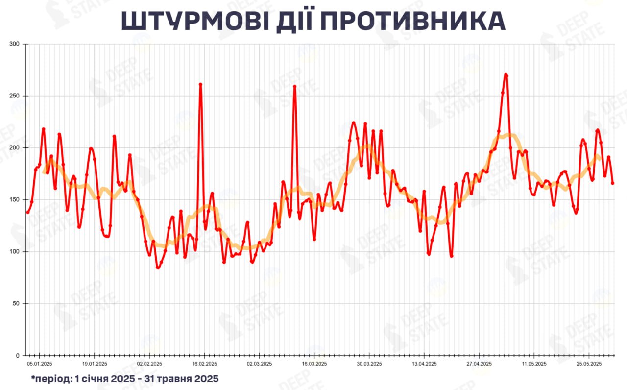 За даними аналітичного проєкту DeepState, у травні 2025 року середня кількість щоденних наступальних атак російських окупаційних військ зросла на 19% порівняно з квітнем.