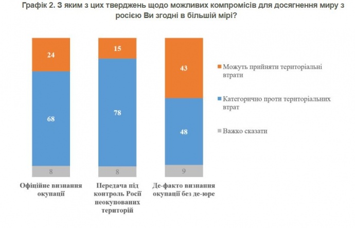 За результатами опитування, 43% українців готові прийняти фактичну окупацію Росією деяких територій країни без юридичного визнання, але за умови гарантій безпеки для України. Проте українці категорично проти офіційного визнання окупації чи передачі РФ територій країни.