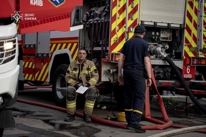 У Києві рятувальники завершили основні роботи з ліквідації наслідків нічного обстрілу РФ, триває гасіння пожежі в Оболонському районі міста.