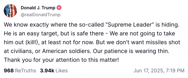 Президент США Дональд Трамп закликав Іран до "беззастережної капітуляції" та виступив із погрозами на адресу верховного лідера Ірану аятоли Алі Хаменеї на тлі зростання напруги між Тегераном та Ізраїлем.
