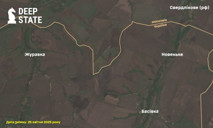Також вони навели приклад супутникового знімка за 25 квітня 2025 року, на якому можна побачити, що фортифікації на відтинку Журавка-Новеньке-Басівка повністю відсутні аж до лінії Хотінь-Писарівка-Кияниця-Храпівщина-Юнаківка.