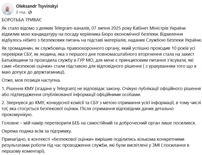 Пряма мова: "Як стало відомо з деяких Telegram-каналів, 07 липня 2025 року Кабінет міністрів України відхилив мою кандидатуру на посаду керівника Бюро економічної безпеки. Відхилення відбулось нібито з безпекових питань на підставі матеріалів, наданих Службою безпеки України.