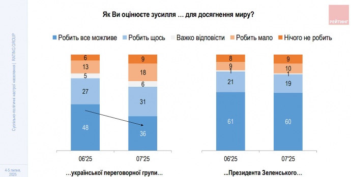 Дослівно соціологи: "Оцінка зусиль української переговорної групи щодо досягнення миру знизилась: у червні 48% респондентів вважали, що вона "робить усе можливе", а в липні цю думку поділяють 36%".