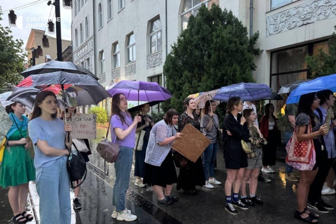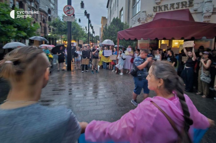 "Суспільне Дніпро" публікує фото з акції у Дніпрі. Там люди зібрались під дощем біля готелю "Україна".