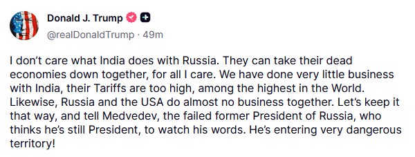 "Мені байдуже, чим Індія займається з Росією. Вони можуть разом завалити свої мертві економіки, мені байдуже. У нас дуже мало співпраці з Індією, їхні тарифи надто високі, майже найвищі у світі", – написав Трамп.
