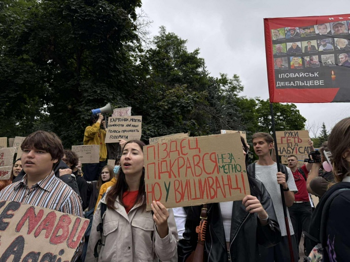 В Маріїнському парку триває мирний мітинг в підтримку ухвалення закону про повернення незалежності Національного антикорупційного бюро (НАБУ) та Спеціалізованої антикорупційної прокуратури (САП).