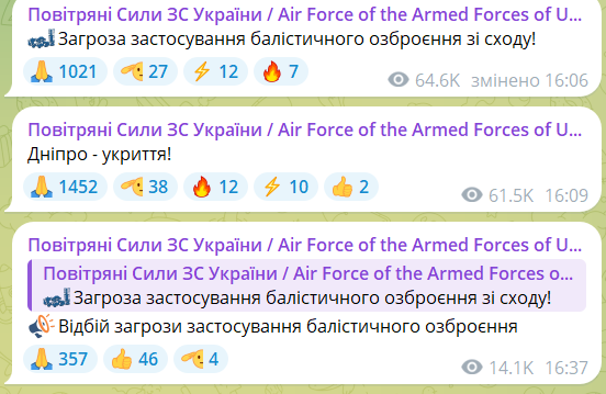 Перед тим, по 16-тій годині Повітряні сили повідомили про загрозу застосування ворогом балістичного озброєння.