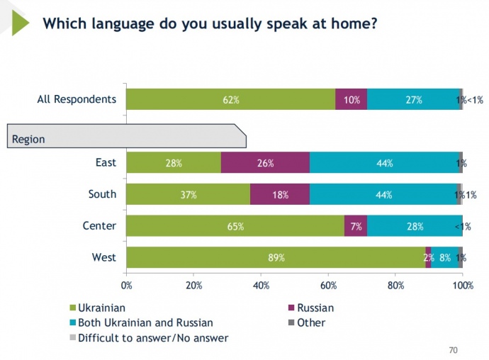 Навіть на сході України українською мовою говорять більше опитаних (28%), ніж російською (26%), водночас 44% відповіли, що говорять вдома обома мовами.