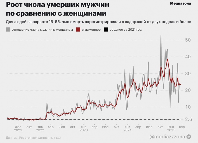 Під час нашої роботи з Реєстром спадкових справ ми виявили новий рекорд чоловічої смертності в листопаді 2024 року – близько 3 тисяч осіб на тиждень", – пише "Медіазона".