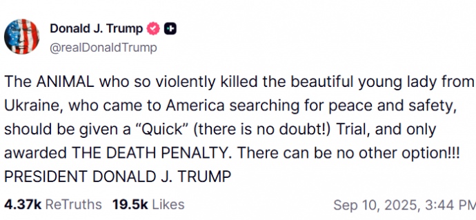 Пряма мова Трампа: "Тварина, яка так жорстоко вбила прекрасну молоду дівчину з України, яка приїхала до Америки в пошуках миру і безпеки, повинна зазнати "швидкого" (без сумніву!) судового розгляду і бути засудженою лише до смертної кари. Іншого варіанту бути не може!!!".