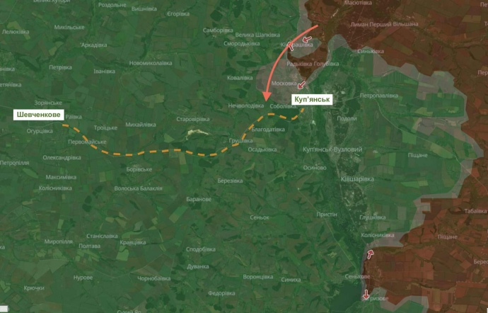 За даними УП у Силах оборони, ситуація на Купʼянському напрямку дуже складна. Російська армія, рухаючись від свого виступу північніше Купʼянська, дійшла до основної дороги до міста Шевченкове-Первомайське-Грушівка-Благодатівка-Купʼянськ. Таким чином окупанти хочуть взяти місто в кільце.