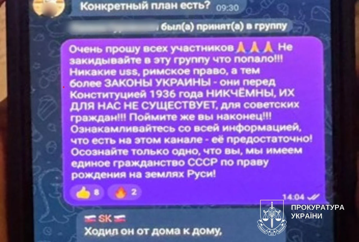 Встановлено, що фігуранти спілкувались через мережу створених ними Телеграм-каналів, в яких координували діяльність псевдодержавних установ, організовують так звані "об'єднуючі з'їзди громадян СРСР", приймали власні закони та ставили собі за мету відновити радянські державні органи зразка 1936 року. Водночас члени цього підпільного руху не визнають Конституцію України й будь-які державні інституції.