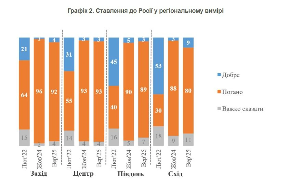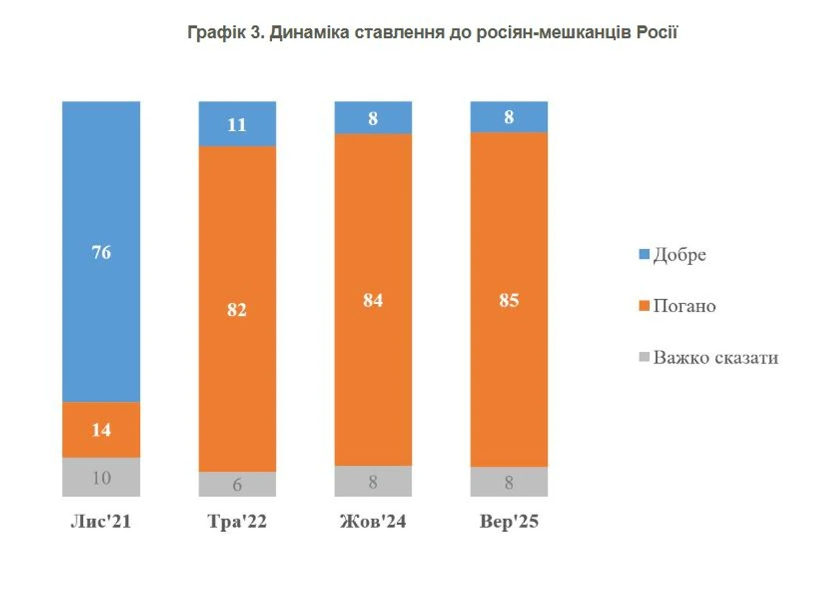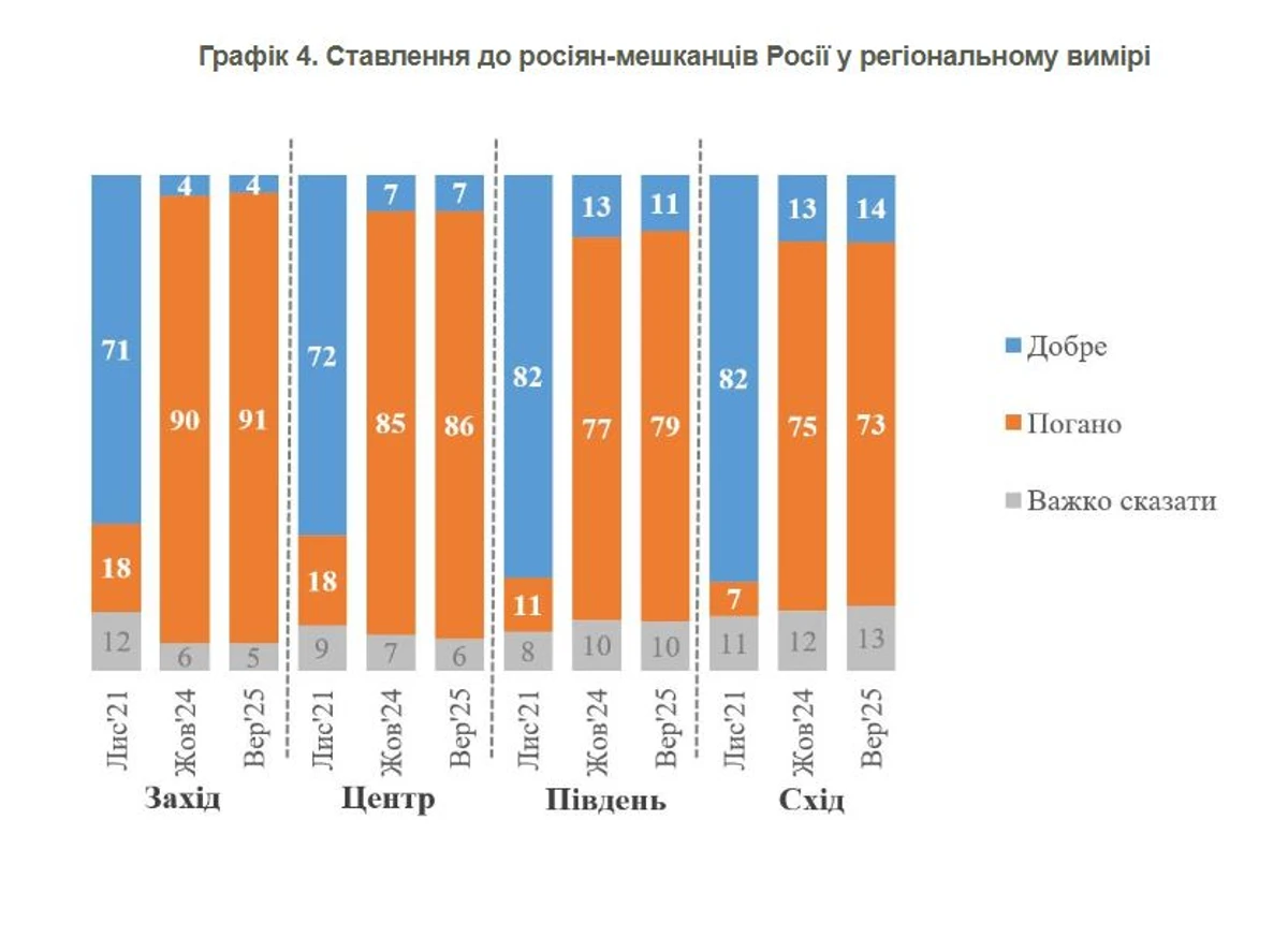 Станом на вересень 2025 року абсолютна більшість українців у всіх регіонах – від 91% на Заході до 73% на Сході – погано ставилась до росіян-мешканців Росії. Частка тих, хто продовжує добре ставитися до них, не перевищує 14% (на Сході).