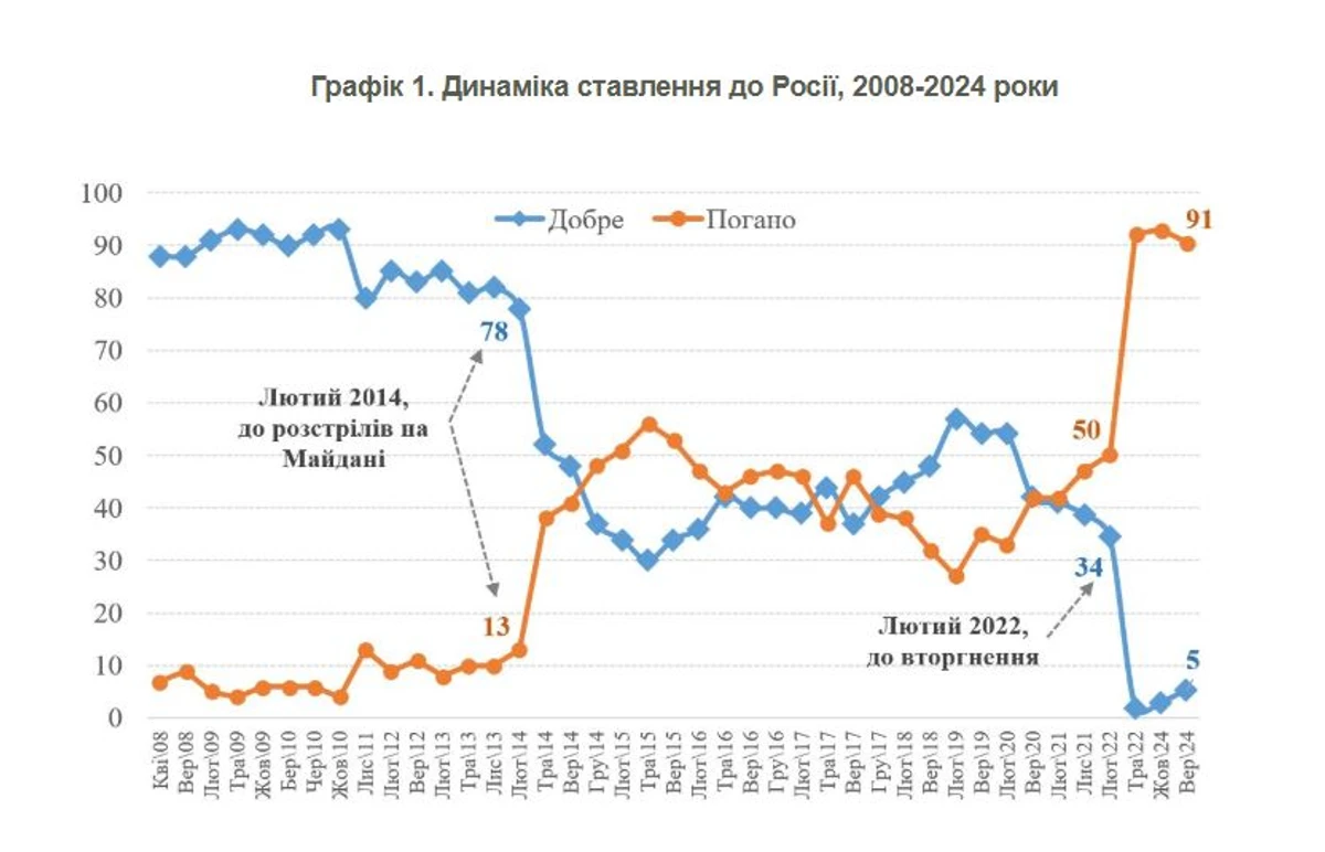 Як вказують у КМІС, фактично зберігається та сама тенденція, яка спостерігається після початку повномасштабного вторгнення в 2022 році – стабільно негативне ставлення до Росії і до росіян.