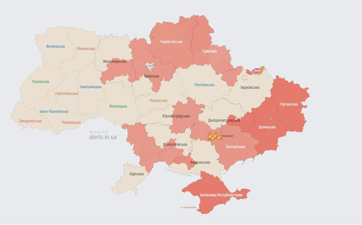 Увечері 30 грудня в Київській та низці інших областей оголосили повітряну тривогу через загрозу російських безпілотників.