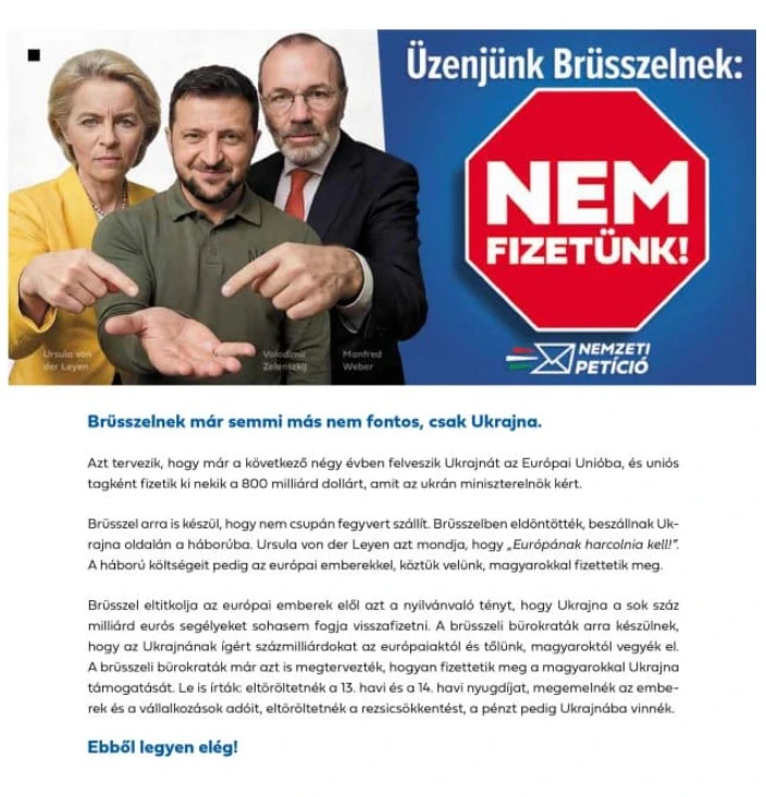 "Брюссель також готується не тільки постачати зброю. У Брюсселі вирішили вступити у війну на боці України. Урсула фон дер Ляєн каже, що "Європа повинна воювати!". А витрати на війну будуть оплачувати європейці, серед яких і ми, угорці. Брюссель приховує від європейців очевидний факт, що Україна ніколи не поверне сотні мільярдів євро допомоги. Брюссельські бюрократи готуються забрати у європейців і у нас, угорців, сотні мільярдів, обіцяних Україні", – йдеться у тексті петиції.