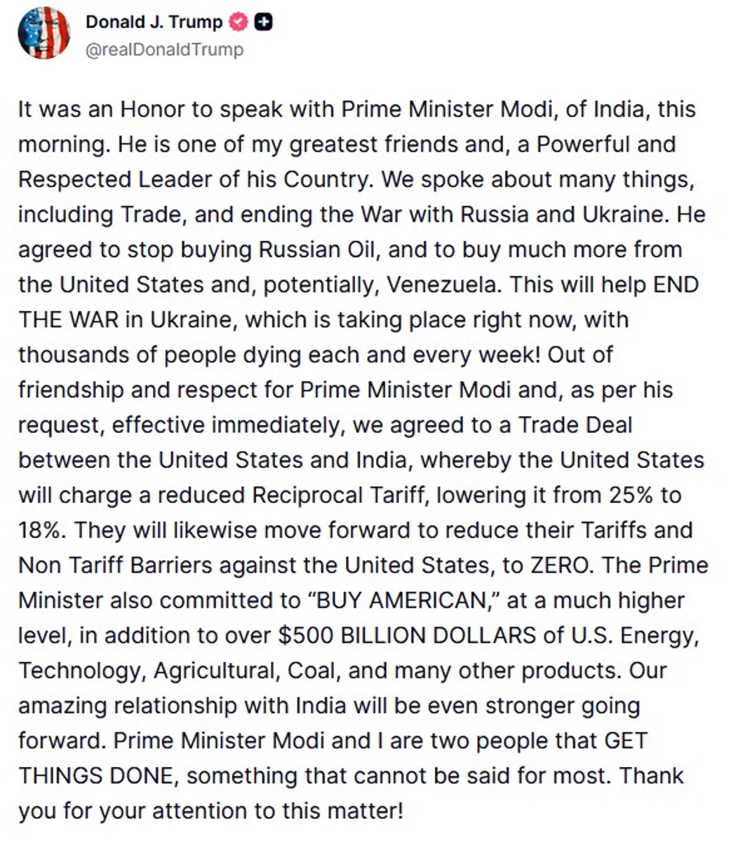 Після розмови з прем'єром Індії Нарендрою Моді президент США Дональд Трамп написав, що індійський урядовий очільник готовий відмовитися від купівлі російської нафти, і пов'язав це з можливістю швидшого завершення війни РФ проти України.