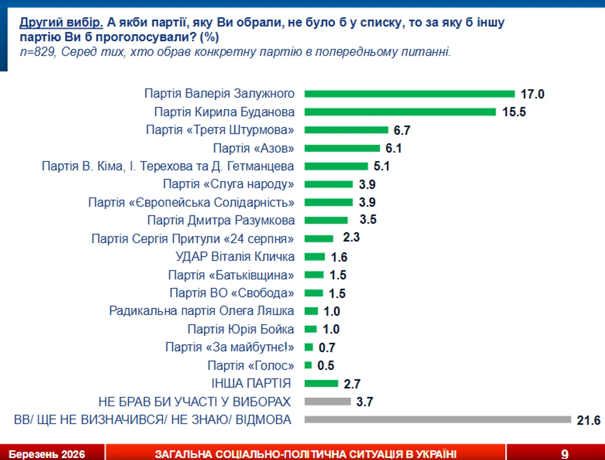 За результатами весняного опитування SOCIS, якби вибори до Верховної Ради відбувалися найближчої неділі, то найбільшу підтримку мали б потенційні партії посла України у Британії Валерія Залужного та керівника ОП Кирила Буданова.