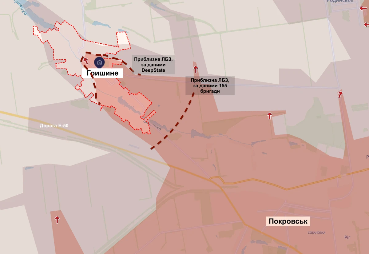 Приблизна лінія бойового зіткнення по Гришиному, за даними 155-ї бригади, проходить за межею самого Гришиного. Тоді як українські осінтери DeepState зображують її по центру села.
