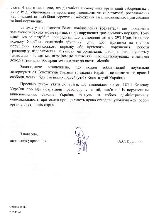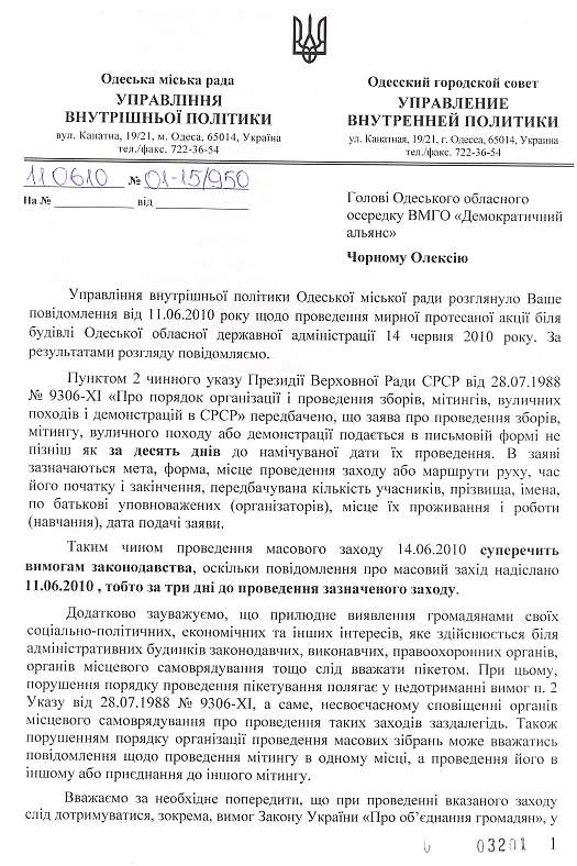 Автор листа, начальник управління внутрішньої політики Одеської міської ради посилався на указ президії Верховної Ради УРСР від 1988 року "Про порядок організації та проведення зборів, мітингів, вуличних акцій і демонстрацій у СРСР".