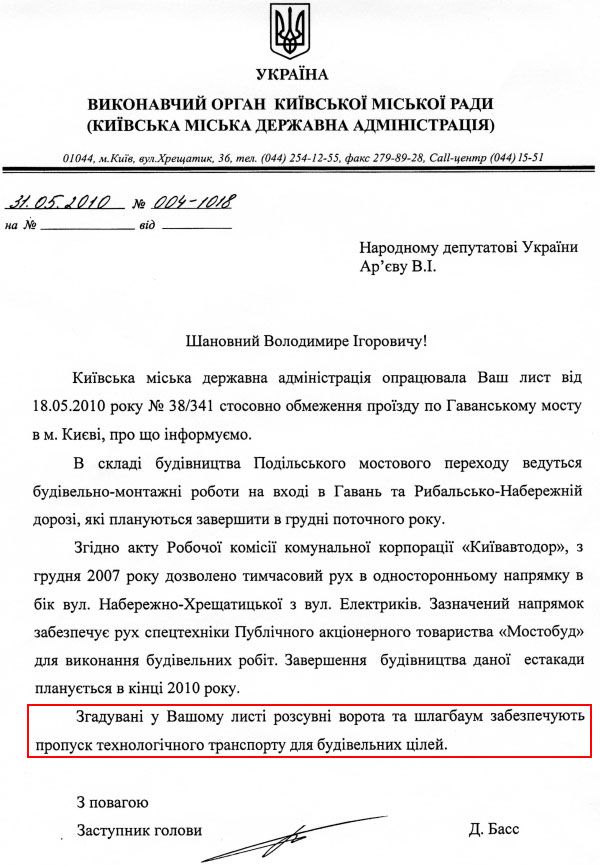 Екс-заступник київського міського голови Денис Басс у відповіді на запит депутата від НУНС Володимира Ар'єва стверджує, що шлагбаум на Гаванському мості у Києві був потрібен, що забезпечувати "пропуск технологічного транспорту для будівельних цілей".