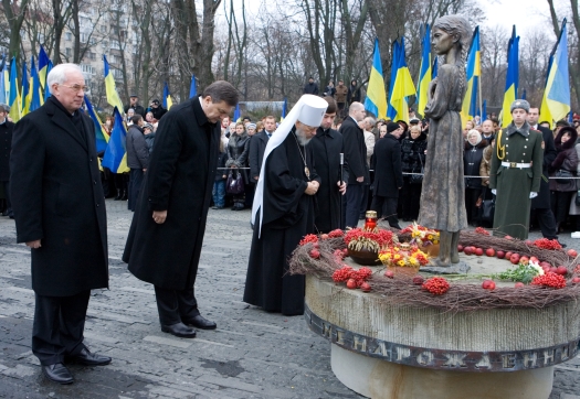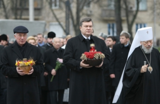 У пам'ять про жертв голодоморів Янукович, Азаров і митрополит Володимир поклали горщики з гілками калини, пшеницею та запаленими свічками до пам'ятника українській дівчинці, яка символізує загиблих під час Голодомору дітей.