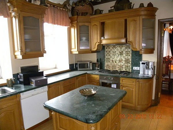 Біля кухні, з якої є чорний вихід, улаштований засклений балкон.