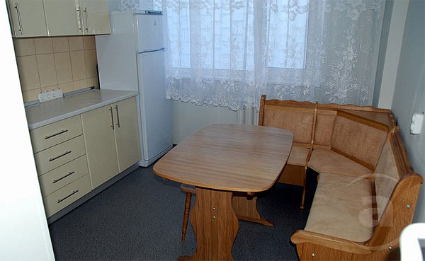 В кімнаті - ліжко, холодильник, телевізор, бра, шафи, кухонний і письмовий столи.