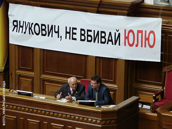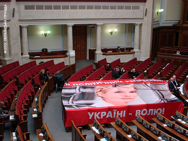 Вхідні двері до президії підперті стільцями, а на стіні президії висить плакат з написом: "Янукович, не вбивай Юлю!".