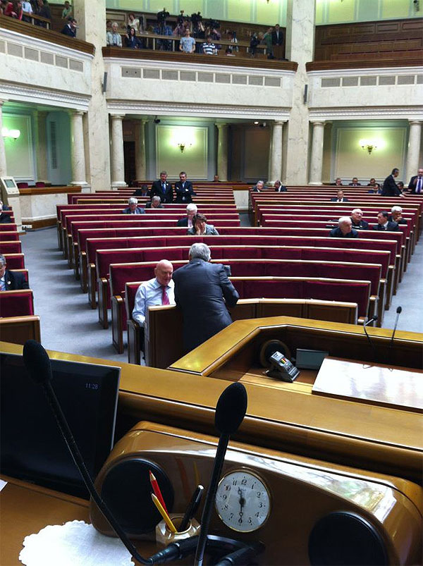 | Зранку на прохання керівництва Партії регіонів журналістів перестали пускати до ложі преси у парламенті. Згодом, після того, як журналісти зчинили скандал, їх почали пускати, але виставили додатковий "кордон" з охорони |