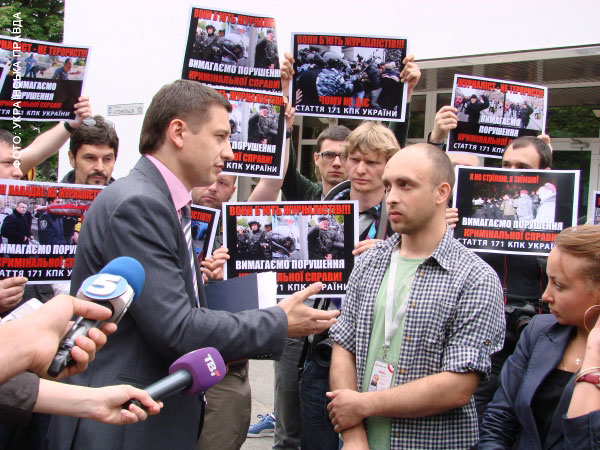 У четвер під стінами МВС пройшла акція журналістів на підтримку їхнього колеги фотографа видання "Tochka.net" Віталія Лазебника, якого було побито в парку "Перемога" 5 травня