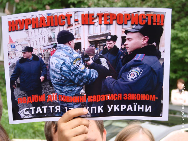 Активісти тримали плакати з зображенням моменту Лазебника і написами: "Журналіст - не терорист" і "Вимагаємо порушення кримінальної справи, стаття кримінального кодексу 171".