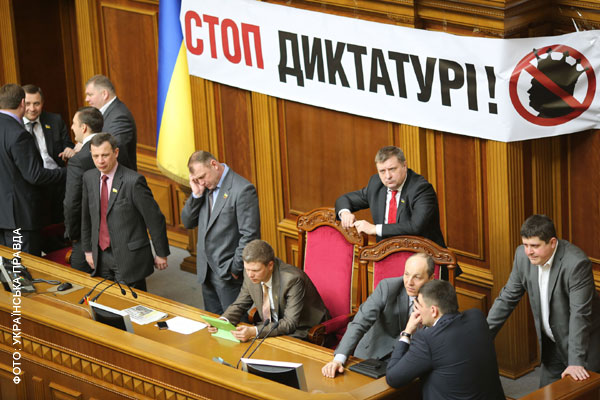 Опозиціонери повісили у президії великий банер з перекресленим профілем президента Віктора Януковича і написом "Стоп диктатурі!".