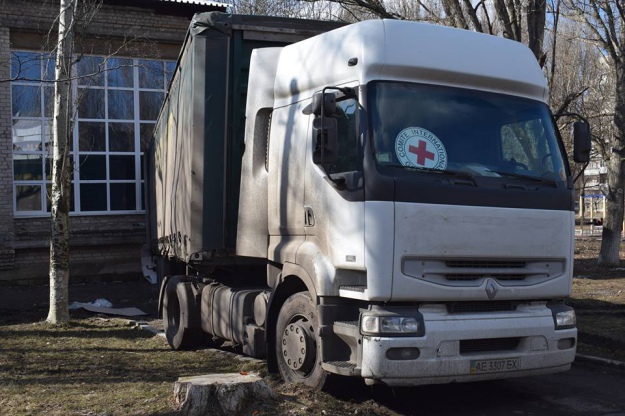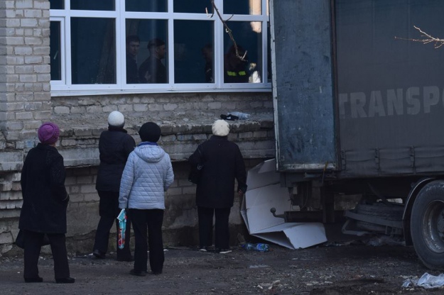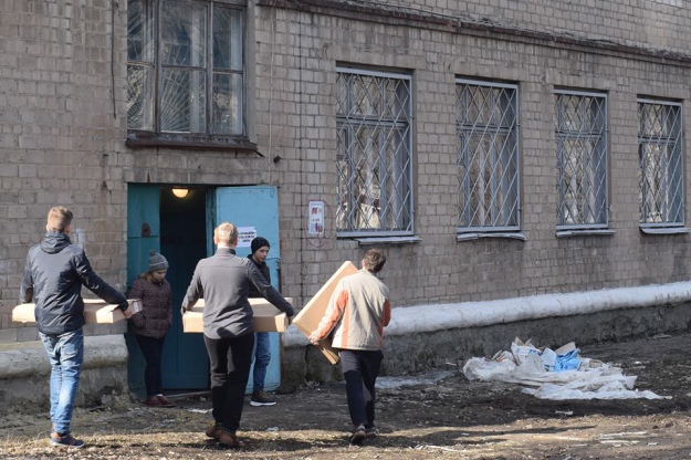 У самій школі працює склад гуманітарної допомоги. З вантажівки Червоного хреста чоловіки розвантажують воду у 6-літрових пляшках.