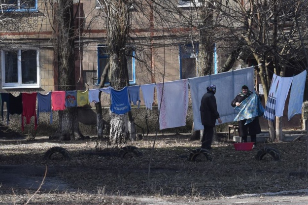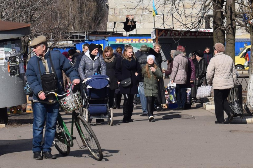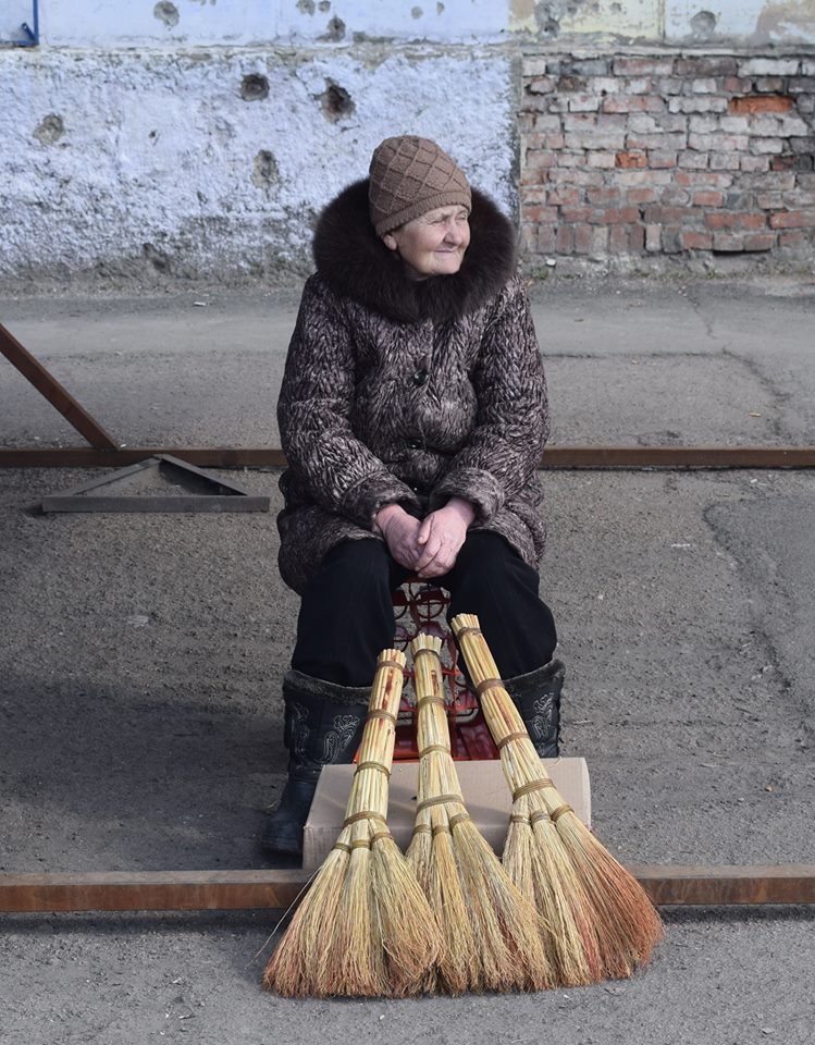 Попри близькість лінії фронту та постійну загрозу обстрілів, на вулицях багато людей. Особливо біля місцевого ринку. Місцеві бабусі намагаються заробити копійчину.