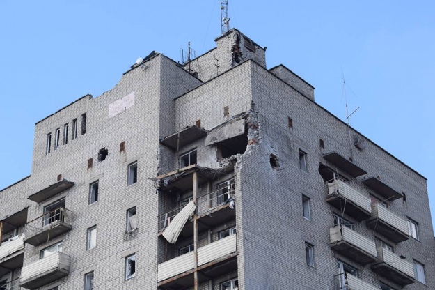 Один з найбільш пошкоджених будинків тут – цегляна 9-поверхівка. Напередодні в неї знову поцілили бойовики. Тут, на даху встановлена камера спостереження ОБСЄ. Саме в неї хотіли влучити, переконанні військові. "Перший снаряд ліг трохи в стороні, десь в районі гаражів, другий вже ближче – у сусідню будівлю, ну а після корегування вогонь вівся більш прицільно", – кажуть на сусідньому блокпосту.