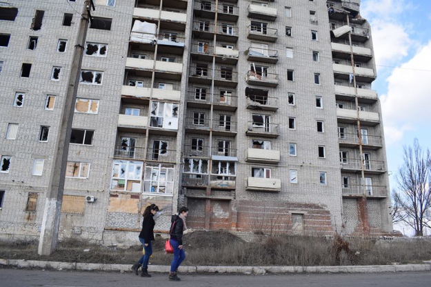 Вогонь по 9-поверхівці вівся з окупованої бойовиками території на ділянці фронту Донецьк-Ясинувата. Протягом дня дорогою з цього боку будинку ходять місцеві жителі. Прямують з нової частини Авдіївки – до старої.