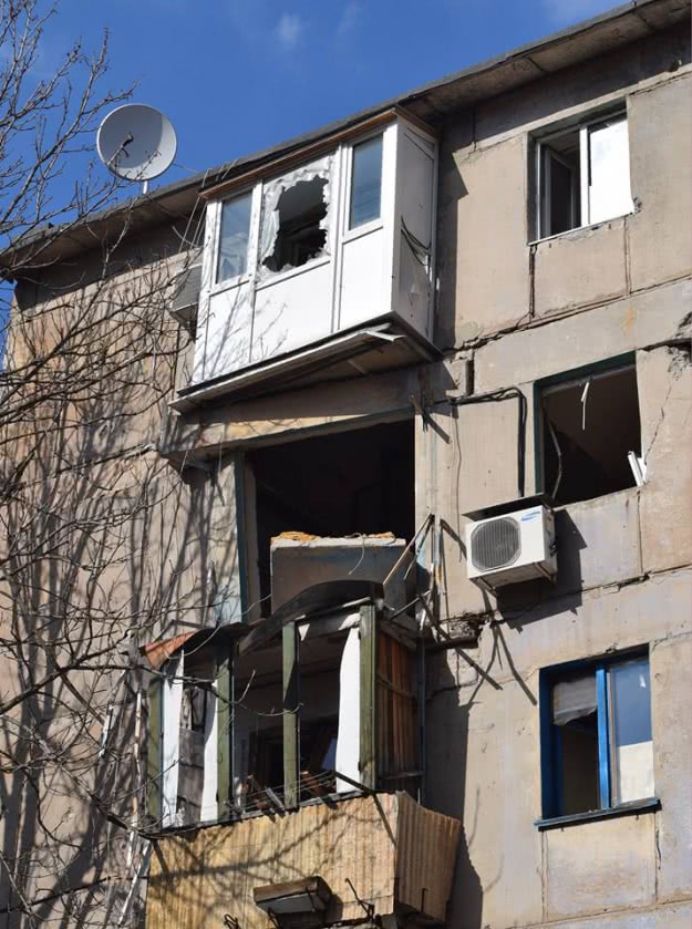 За 150 метрів звідси пошкоджений будинок. 2 березня у цю 5-поверхівку влучив снаряд. Від цього провалилася плита між верхніми поверхами. Це можна побачити навіть з вулиці.