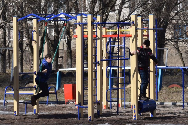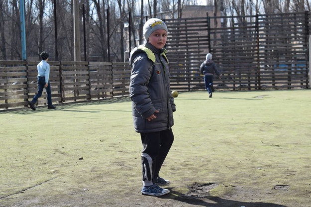 На футбольному майданчику грають два-на-два хлопчики. "2-1, ми виграємо", – каже воротар. З балкону багатоповерхівки своє зауваження висловлює мати одного з юних футболістів: "Чого без куртки? Швидко одягнувся"! Два дні тому снаряд розірвався на відстані лише 20-30 метрів від цих футбольних воріт.