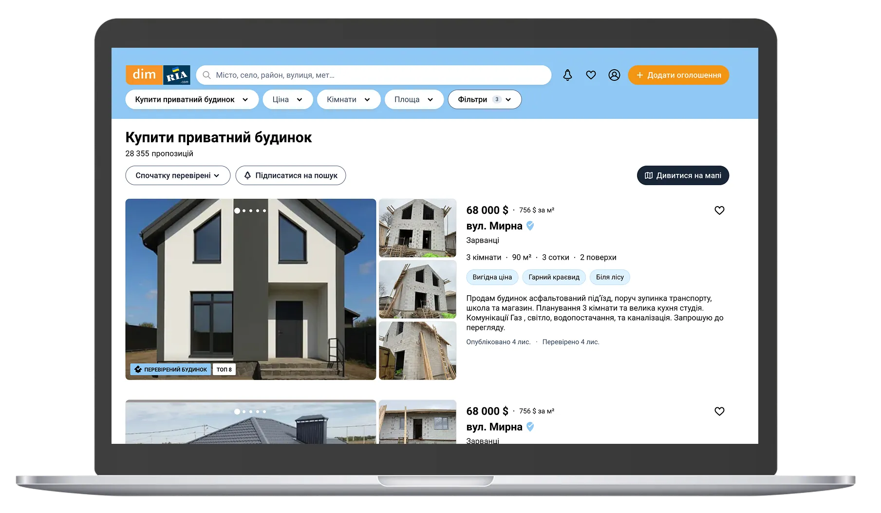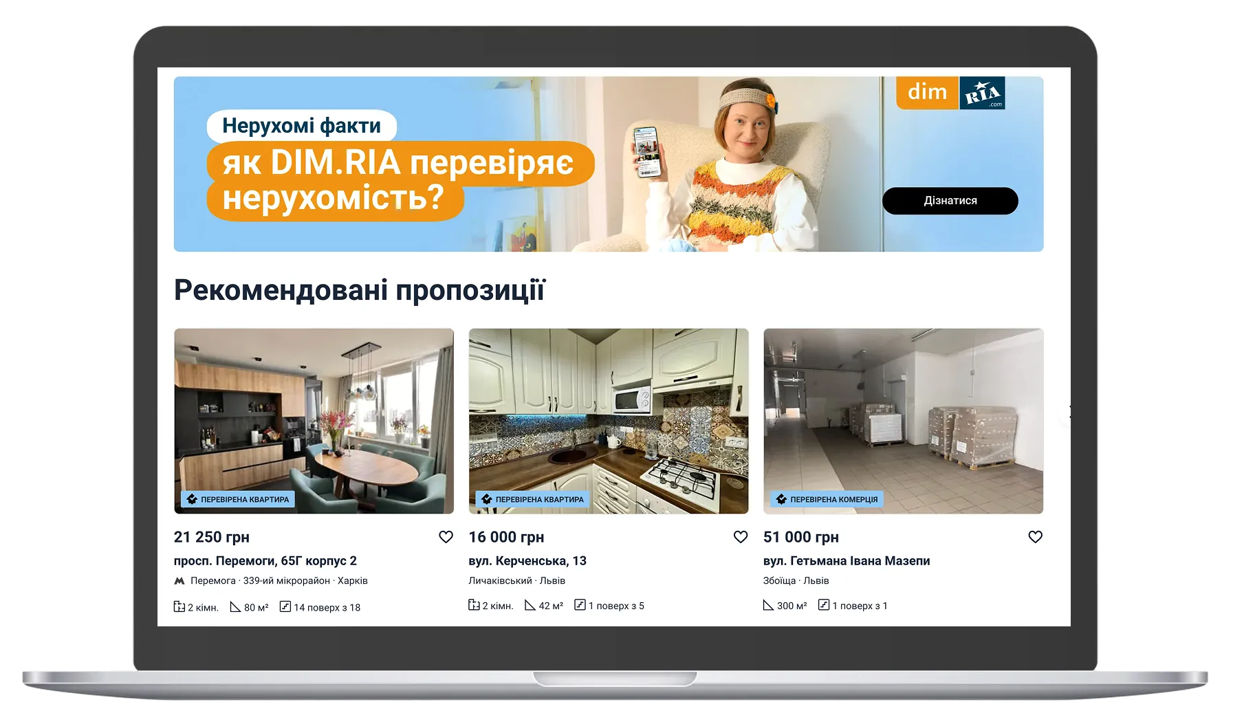Тепер цифри. На сьогодні 91% оголошень у DIM.RIA – перевірені. У пошуку зараз доступно понад 185 тисяч перевірених об’єктів по всій Україні. Для порівняння: загалом на різних порталах можна знайти до мільйона оголошень, але реальних унікальних об’єктів на ринку – близько 180–190 тисяч на рік. Тобто фактично наша база перевірених пропозицій дорівнює всьому обсягу ринку купівлі-продажу.