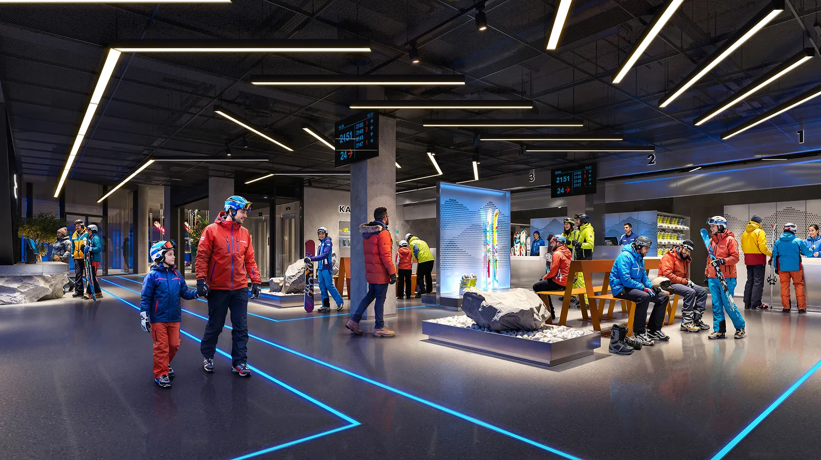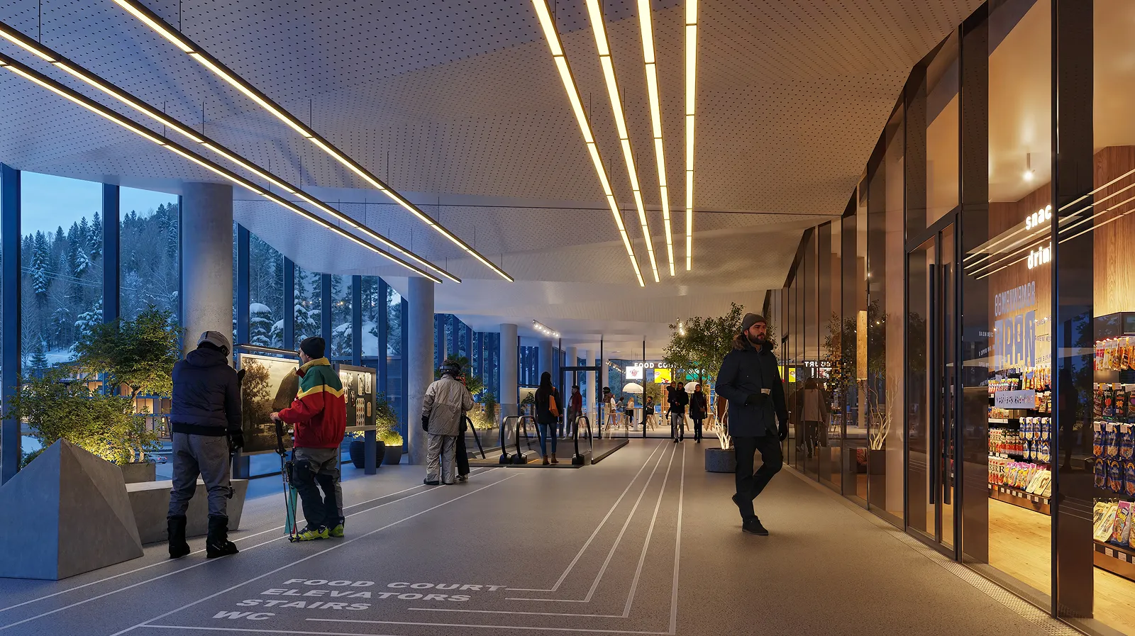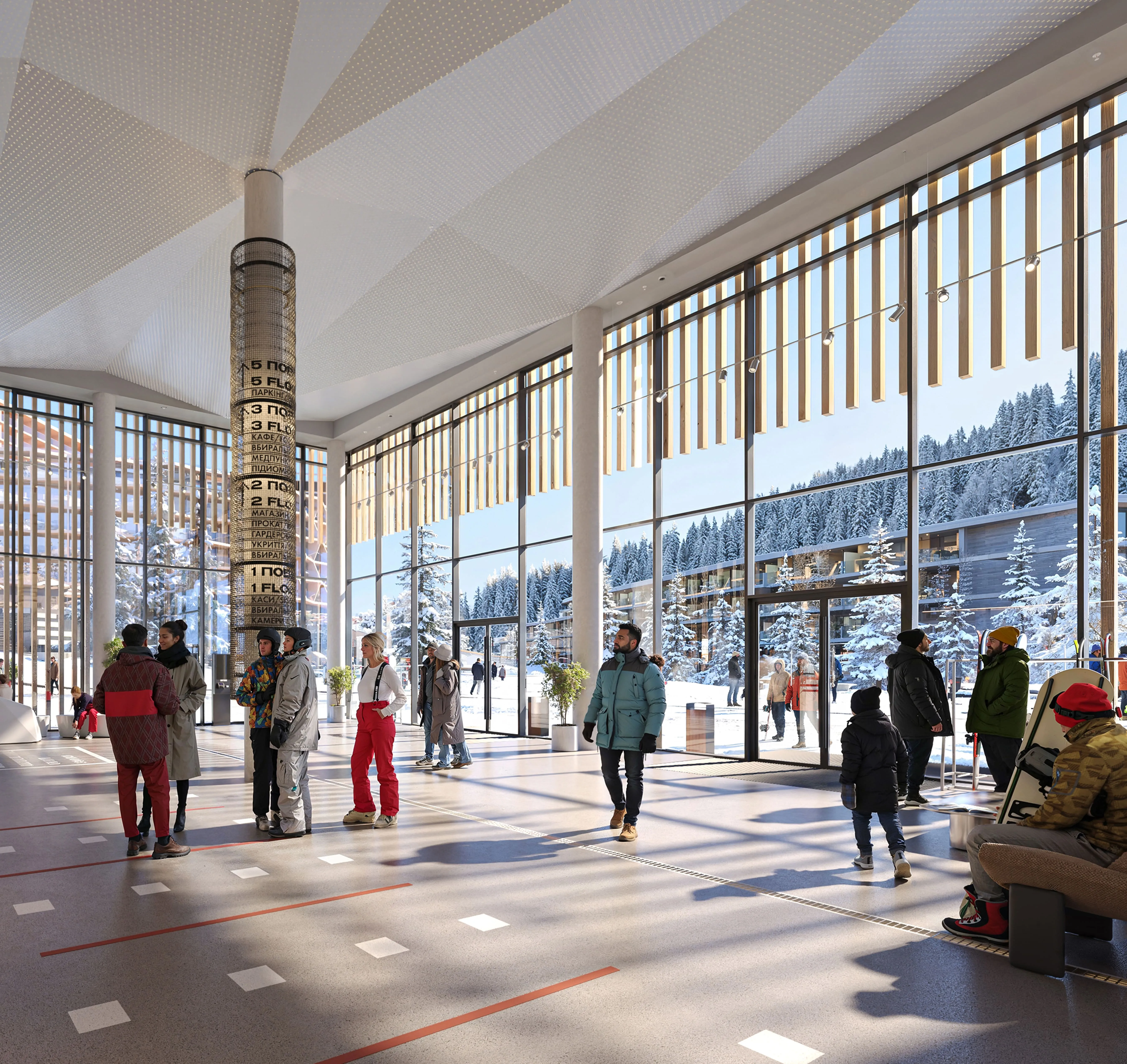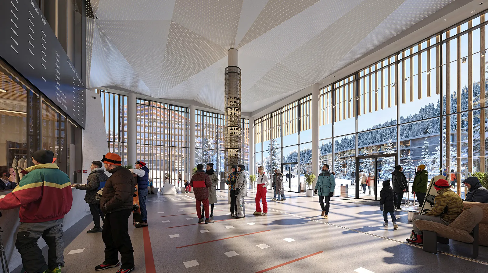 Перше, що побачить гість, потрапивши до Welcome Centre, буде велике інформаційне табло, каси та автомати з продажу скіпасів. Простір спланований так, щоб легко зорієнтуватися і не витрачати зайвий час. На старті відпочинку люди найбільше втомлені після дороги, тому перша зона має працювати інтуїтивно: видно, куди йти далі, без додаткових питань.