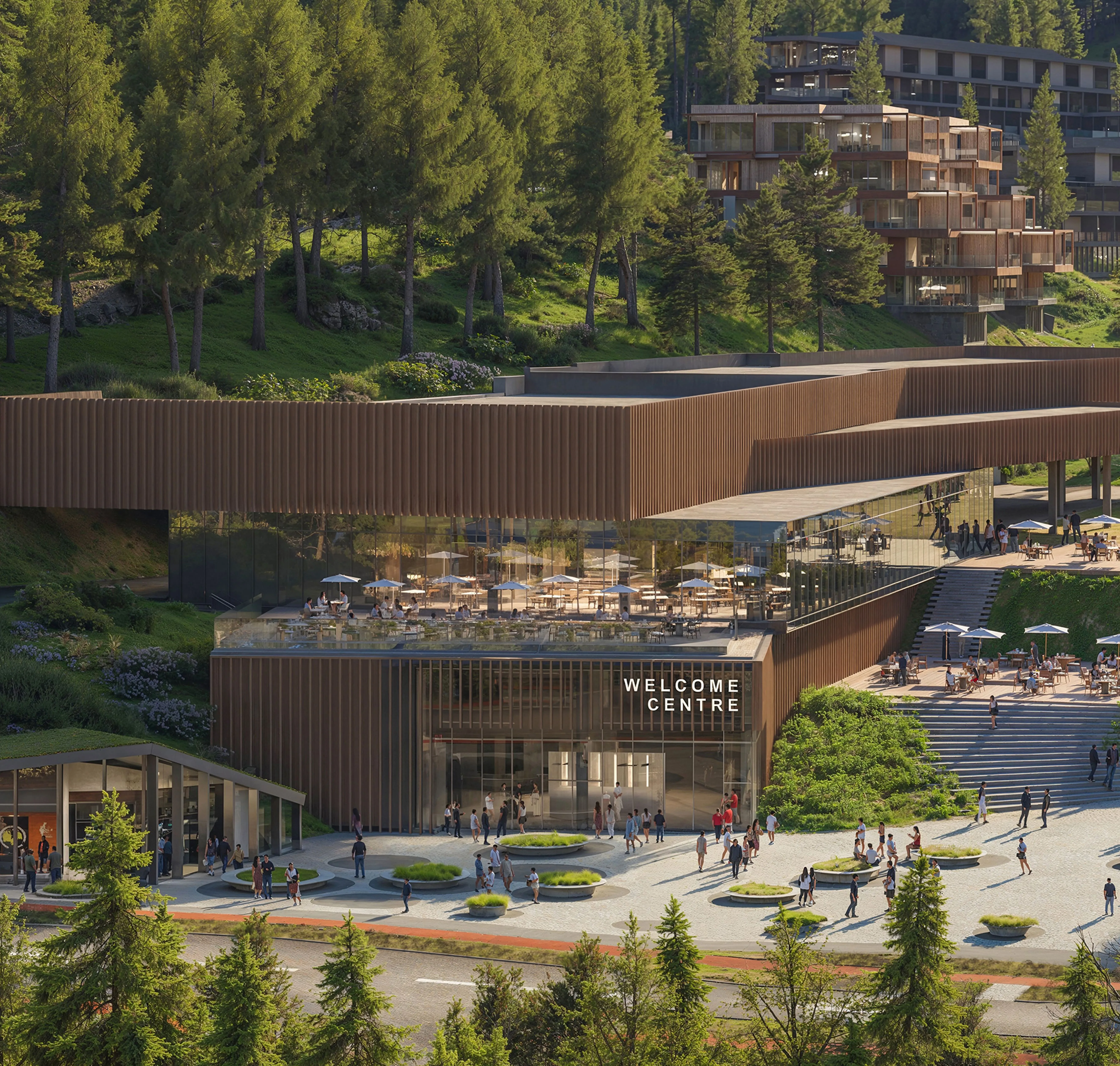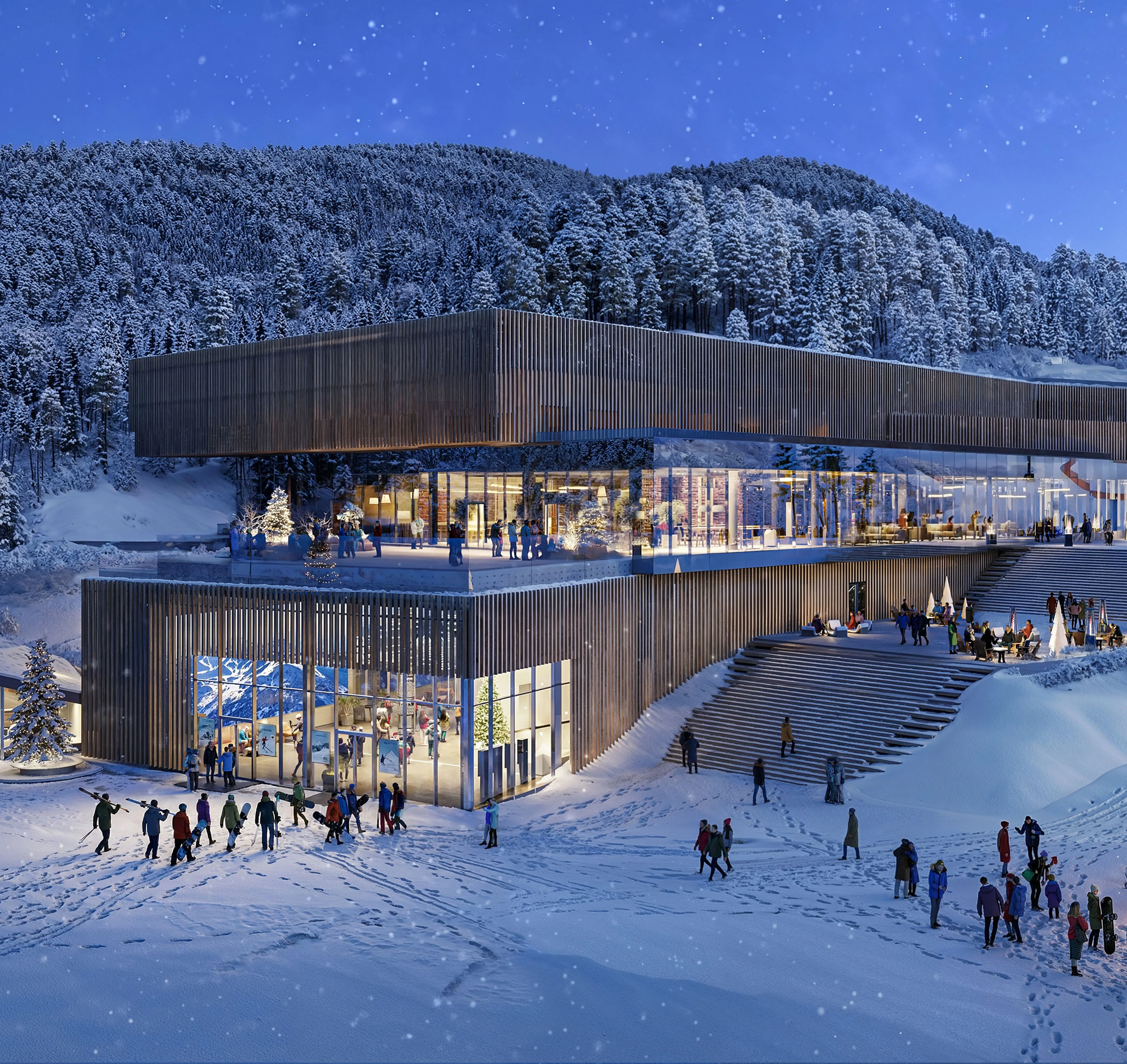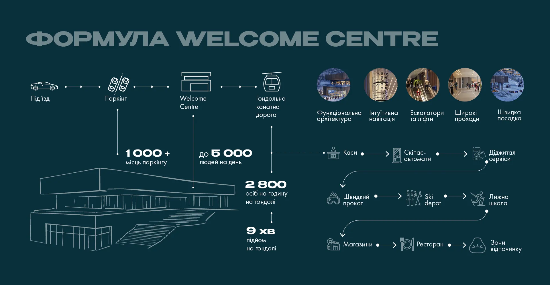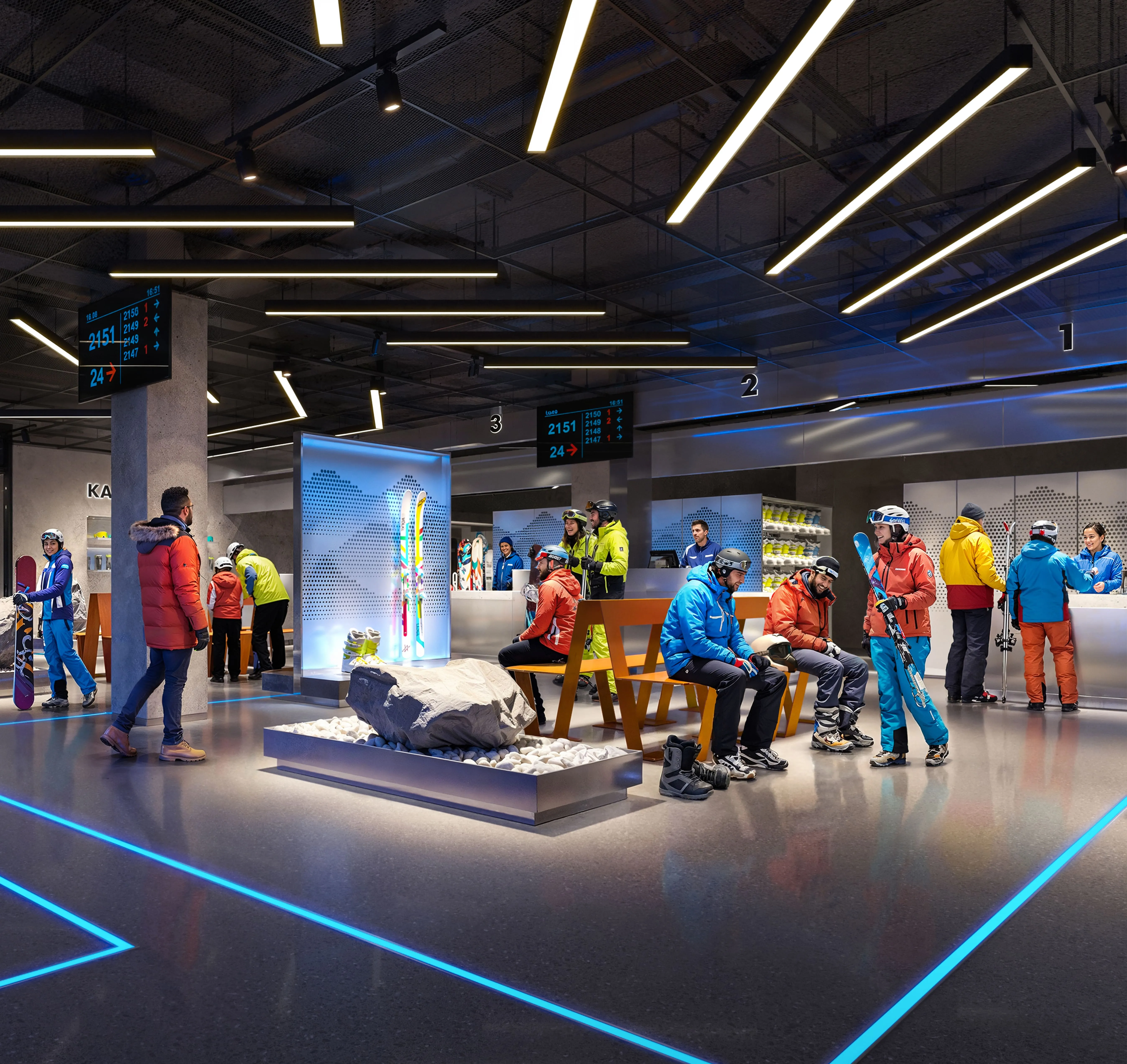 Перше, що побачить гість, потрапивши до Welcome Centre, буде велике інформаційне табло, каси та автомати з продажу скіпасів. Простір спланований так, щоб легко зорієнтуватися і не витрачати зайвий час. На старті відпочинку люди найбільше втомлені після дороги, тому перша зона має працювати інтуїтивно: видно, куди йти далі, без додаткових питань.