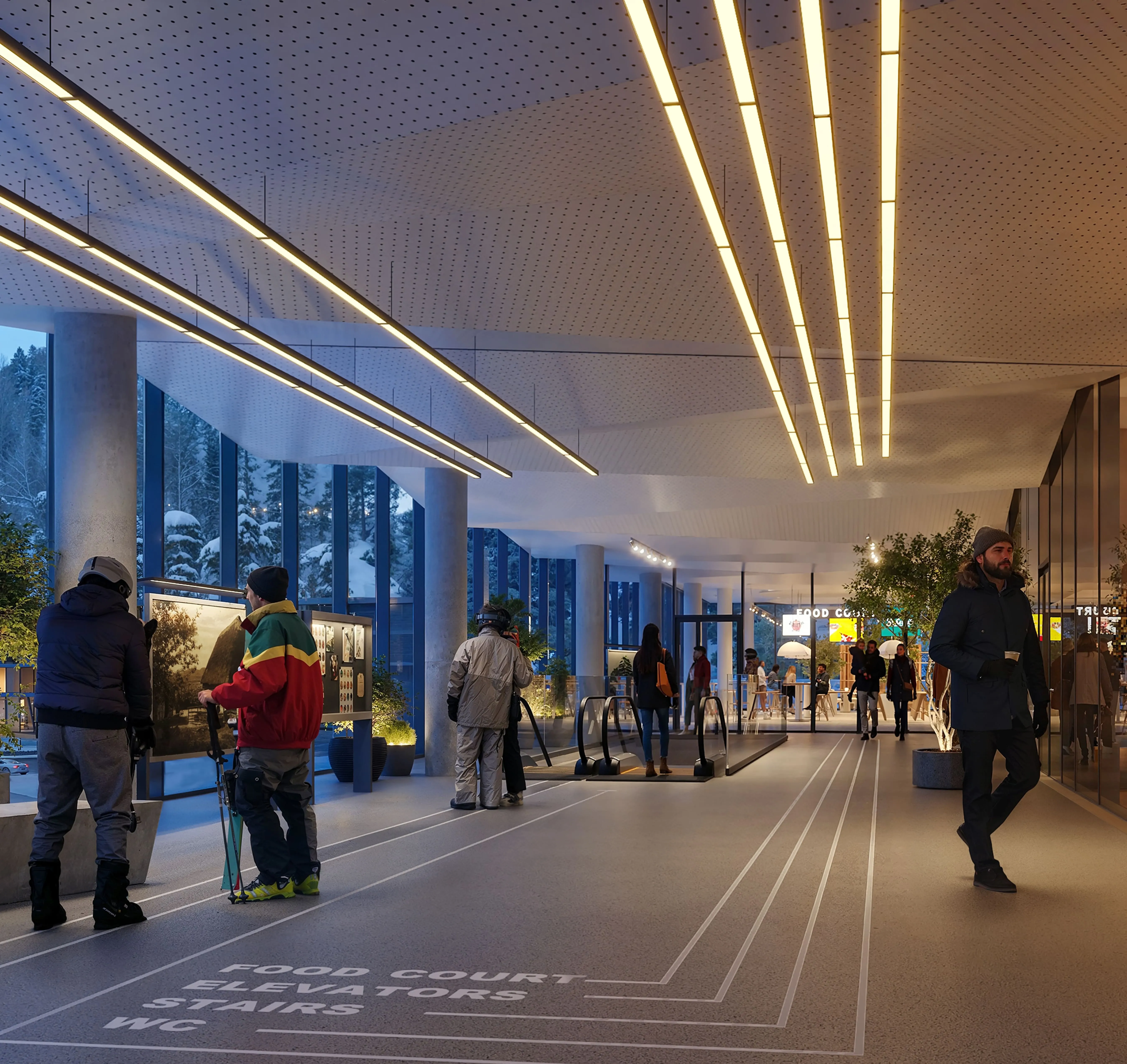 Навігацію в Welcome Centre продумано за логікою аеропорту або великого вокзалу: зрозумілі маршрути, багато простору й чіткий рух потоків між рівнями. Основний потік гостей підіймається та спускається ескалаторами, щоб усе відбувалося швидко й без "вузьких місць". Це принципово для гірського курорту: коли люди рухаються зі спорядженням, навіть невелика тиснява створює затори та черги. Ліфти теж є, їх спеціально спроєктували з урахуванням доступності та інклюзивності, зробили зручними для людей на кріслах колісних та батьків із дитячими візочками.